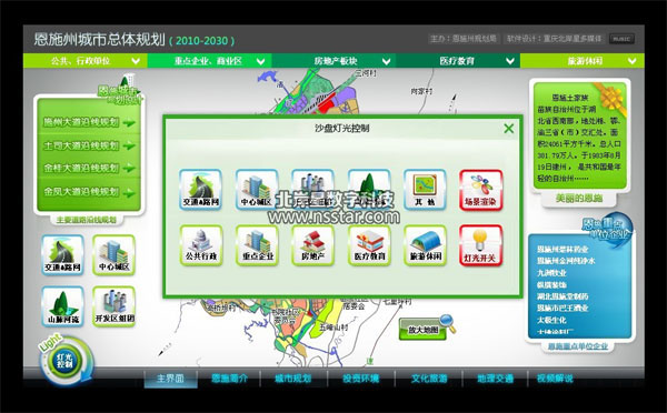 软件可控制沙盘灯光,摇头灯,渲染灯,并且可以查看到城市介绍,招商流程,规划现状和未来规划,旅游信息,地理交通信息,视频和解说词等等非常详细强大的功能展示。