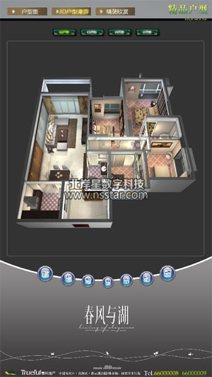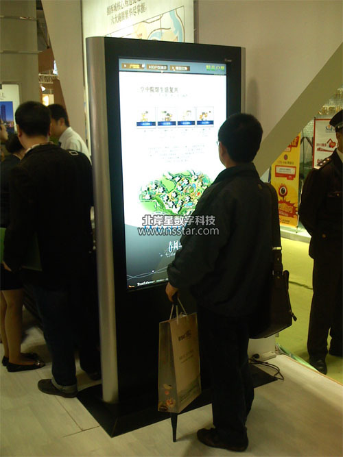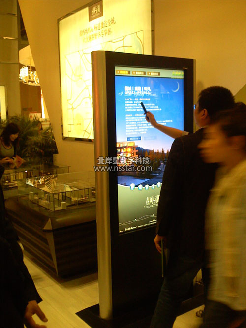 本系统采用55寸超大含 双点触摸功能的立式触摸屏一体机。软件除了含 有丰富的楼盘介绍信息以外,还可以对地图、图片、户型进行双点缩放。并含 有3D户型欣赏,支持旋转和漫游。